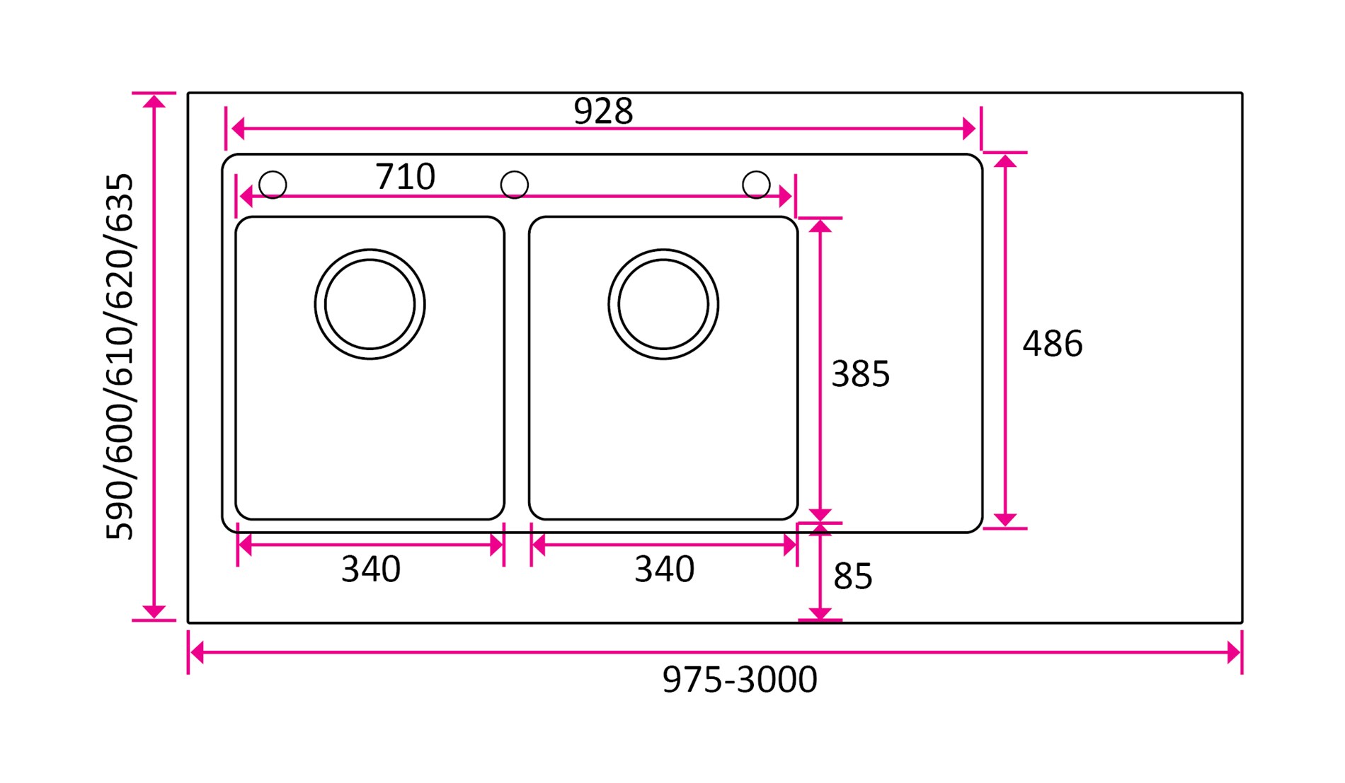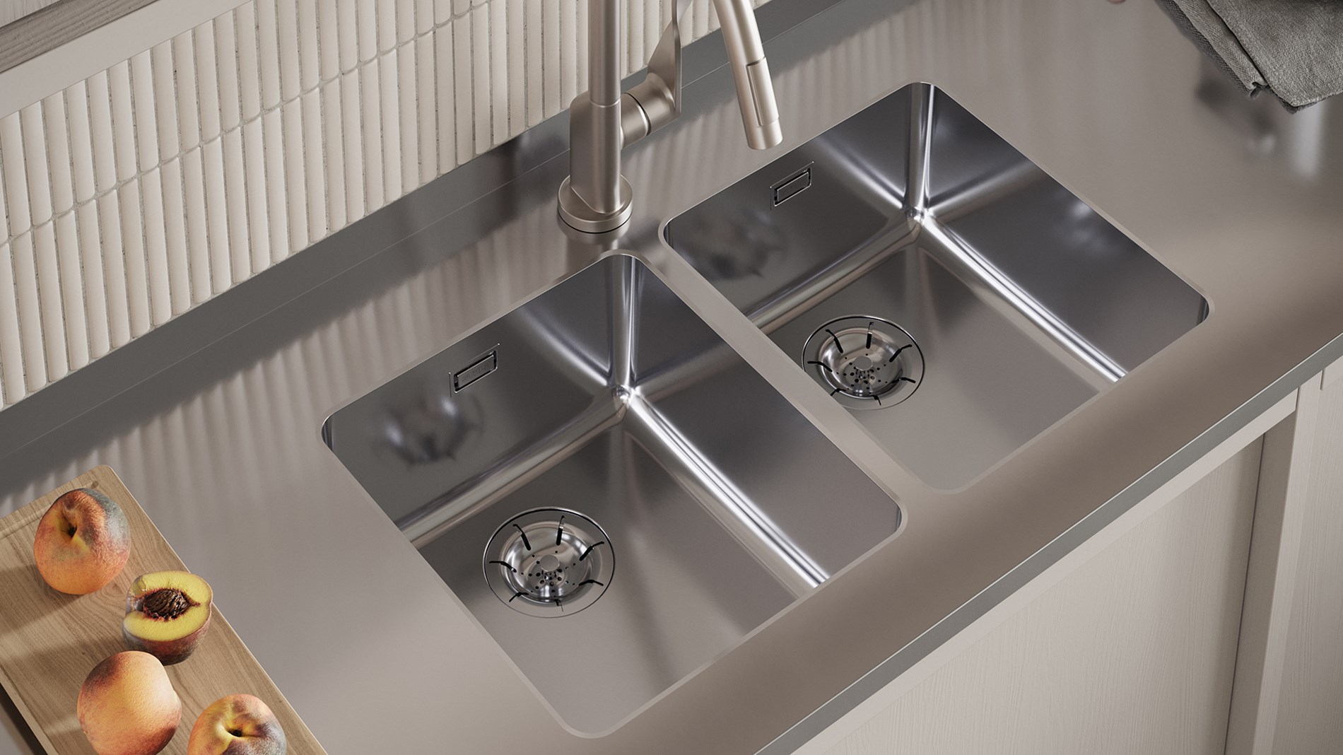 Det funksjonelle området (sidefeltet) kan plasseres enten på venstre eller høyre side av vasken, avhengig av hvordan benkeplaten er utformet.